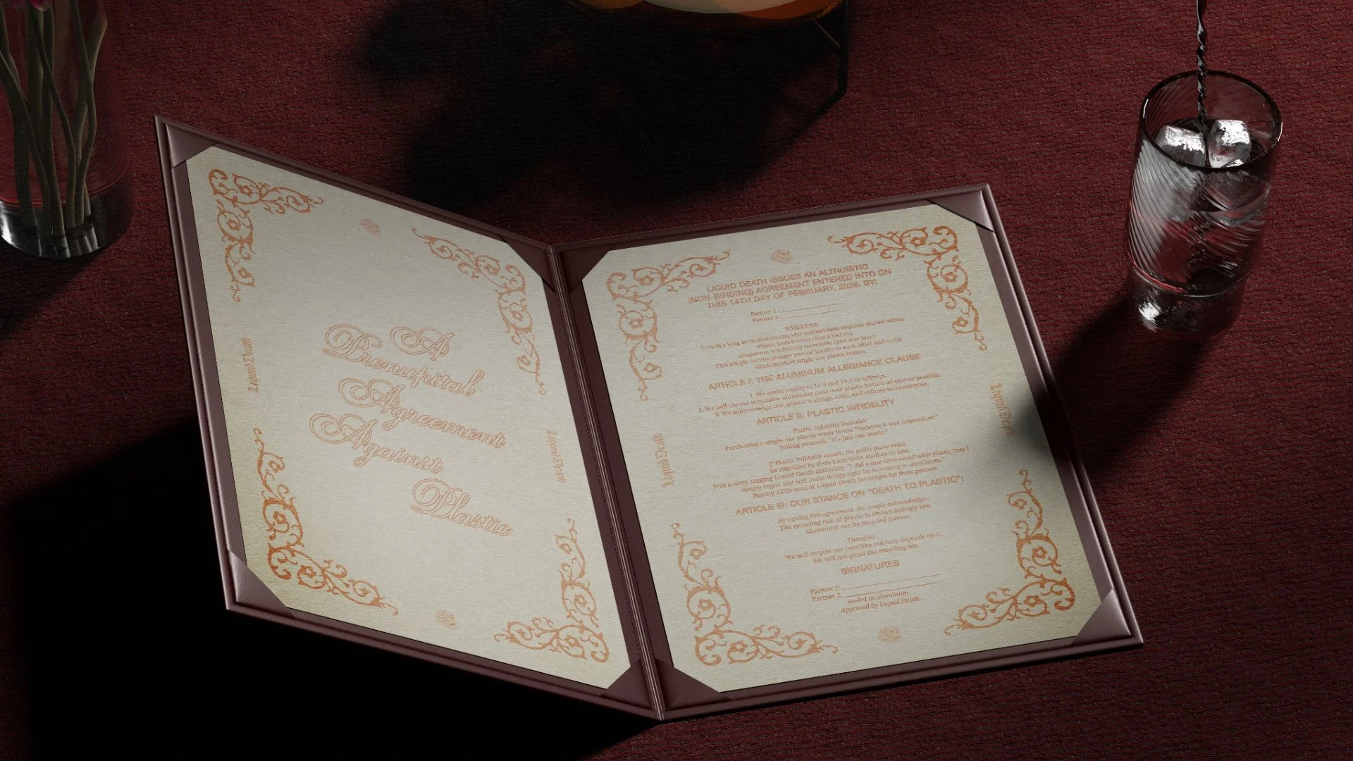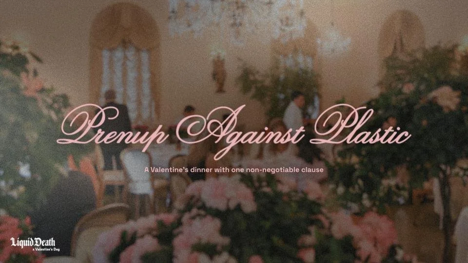 At the end of their dinner, the couple will receive a Liquid Death ratified certificate, signifying their commitment to each other and Death to Plastic.