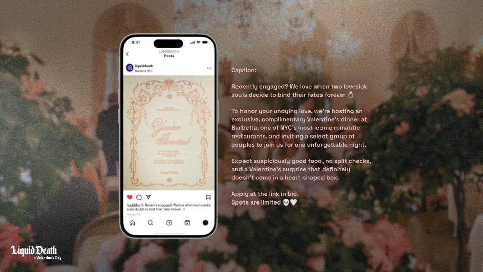 Liquid Death will launch a social post inviting recently engaged couples to dine at Barbetta for Valentine’s Day